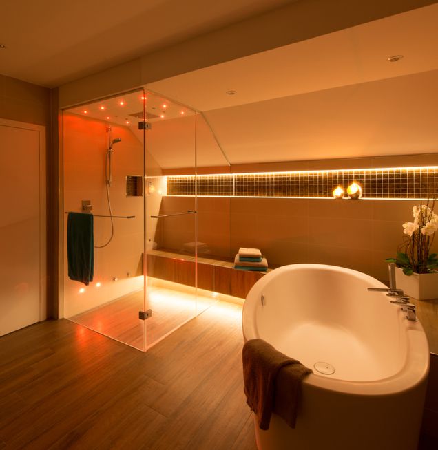 Kleines Bad Badewanne Fliesen Farben Mosaik Orange Creme Indirekte Beleuchtung Led Badezimmer Dekor Badezimmereinrichtung Badezimmer Braun