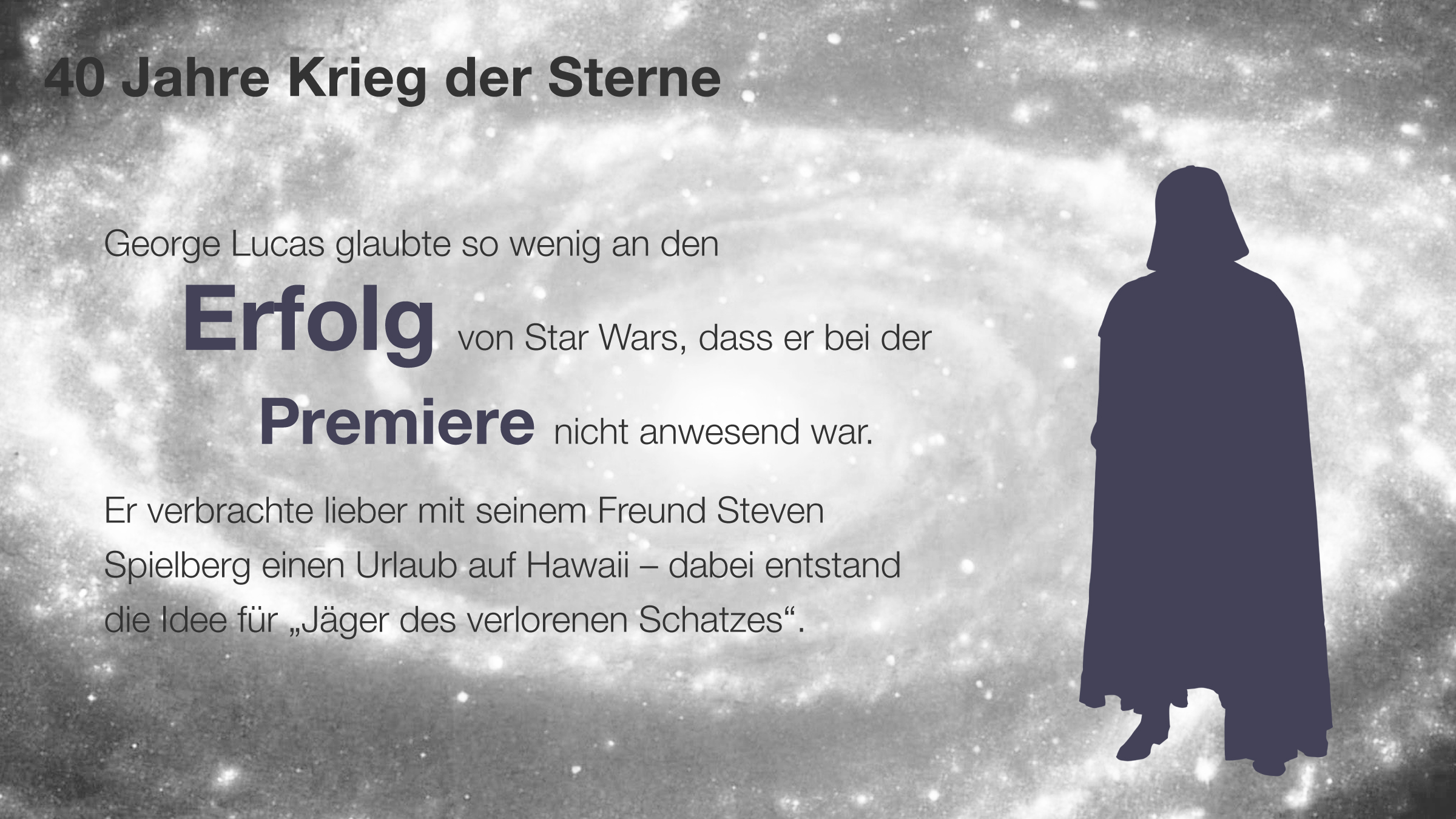 Regie führte George Lucas der für den ersten Teil Krieg. Am Anfang stößt sich ein Stormtrooper den Kopf an der Schleuse. TV-Krimi mit Ottfried Fischer.