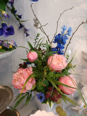 Jeder Kunstblumenstrauß besteht aus echten Seidenblumen.